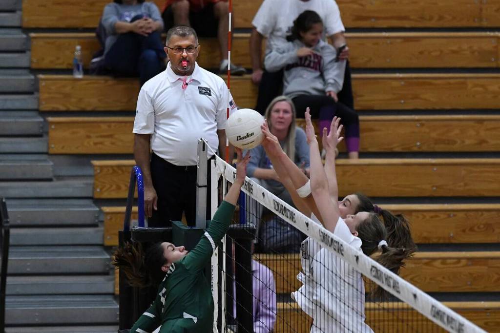 At left, Redmond’s Bhavya Garlapati attacks the net against North Creek’s Jenna Howard and Grace Medjo during the Jaguars’ 3-0 volleyball win on Oct. 7. The referee is Raiz Kanji. Photo courtesy of Dale Garvey