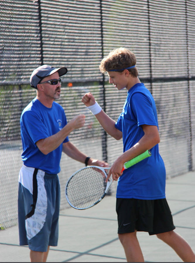 Bothell High coach Mike Pizzo and Johnny Schuller bump fists at a tennis match this season. Photo courtesy of Sam Ames