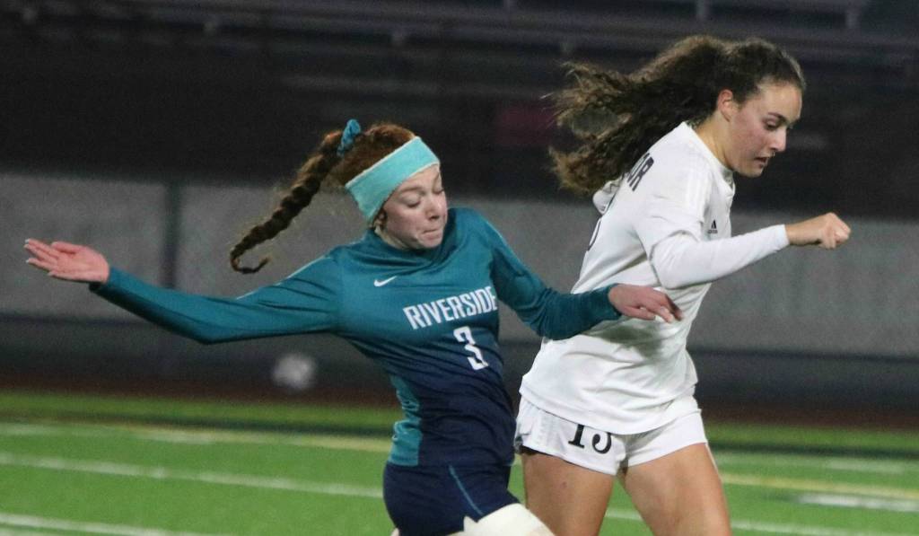 Inglemoor’s Tara Barlowe, right, battles Auburn Riverside’s Sierra Parshall in the 4A state semifinals on Friday at Sparks Stadium in Puyallup. Auburn Riverside won, 2-0. Inglemoor will play Gonzaga Prep in the third/fourth-place match at noon on Saturday at Sparks. Andy Nystrom/ staff photo