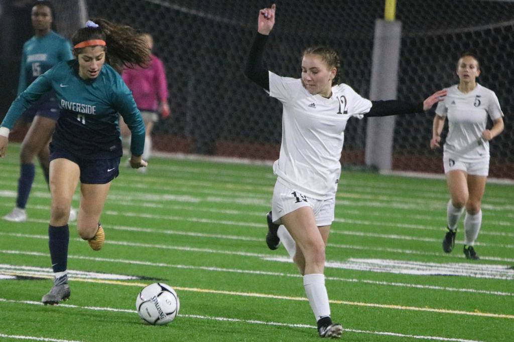 In the semifinal, Inglemoor’s Ashly Berge hit the crossbar twice early on and Tara Barlowe had a shot denied by the goalkeeper from close range before Auburn Riverside tallied a goal in the 26th minute. Inglemoor goalkeeper Teonni Gonzales made a diving save of her own in the first half.