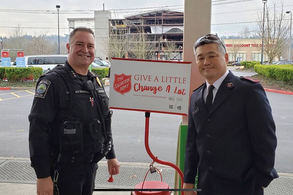 It was the first to take place on the Eastside, with Seuberlich, Bellevue Police Chief Steve Mylett and Bellevue Fire Chief Jay Hagen competing. On Nov. 23, all three stood outside Fred Meyer stores in Bothell and Bellevue with small bells and the red kettles used for Salvation Army donation collection.
