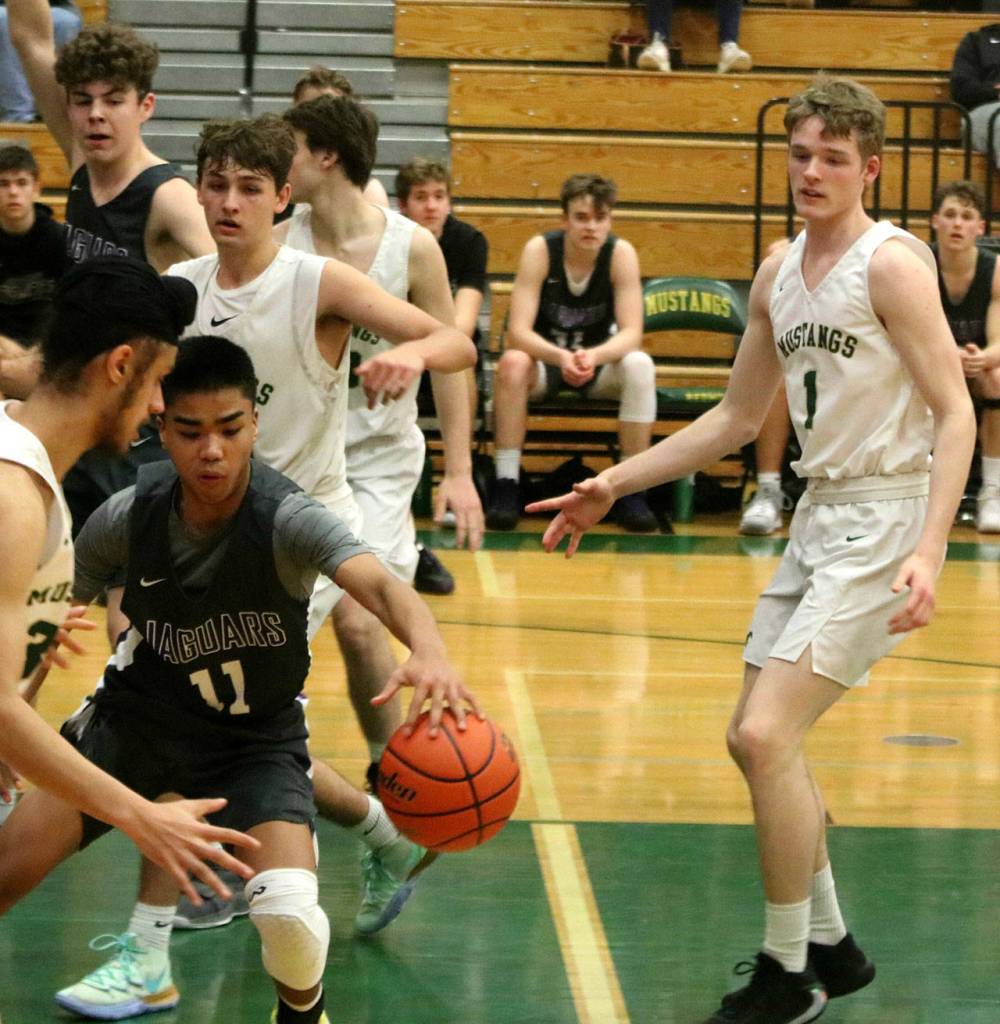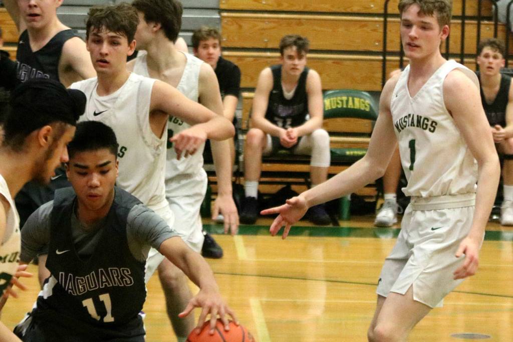 North Creek’s Matt Suguitan (11) battles for the ball during the Jaguars’ 57-47 loss to Redmond on Jan. 7. North Creek’s Garrison Kepley led the Jaguars with 15 points and eight rebounds. North Creek rebounded with a 64-61 win over Newport on Jan. 10 and lost to Woodinville, 42-37, on Jan. 11. Andy Nystrom/ staff photo
