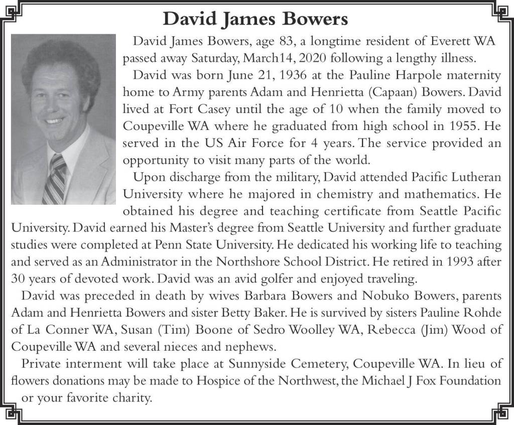 David was preceded in death by wives Barbara Bowers and Nobuko Bowers, parents Adam and Henrietta Bowers and sister Betty Baker. He is survived by sisters Pauline Rohde of La Conner WA, Susan (Tim) Boone of Sedro Woolley WA, Rebecca (Jim) Wood of Coupeville WA and several nieces and nephews.