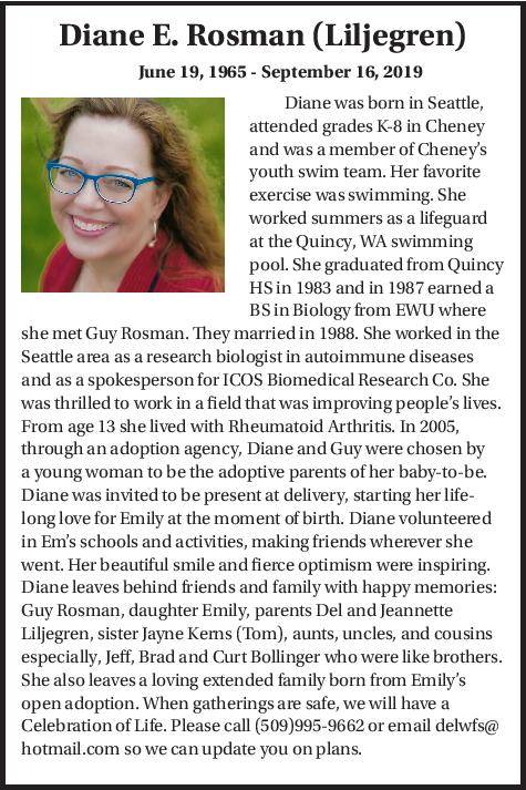 a young woman to be the adoptive parents of her baby-to-be. Diane was invited to be present at delivery, starting her life- long love for Emily at the moment of birth. Diane volunteered in Em’s schools and activities, making friends wherever she went. Her beautiful smile and fierce optimism were inspiring. Diane leaves behind friends and family with happy memories: Guy Rosman, daughter Emily, parents Del and Jeannette Liljegren, sister Jayne Kerns (Tom), aunts, uncles, and cousins especially, Jeff, Brad and Curt Bollinger who were like brothers. She also leaves a loving extended family born from Emily’s open adoption. When gatherings are safe, we will have a Celebration of Life.