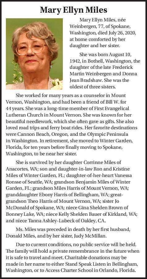 Mary Ellyn Miles, née Weinbergen, 77, of Spokane, Washington, died July 26, 2020, at home comforted by her daughter and her sister.