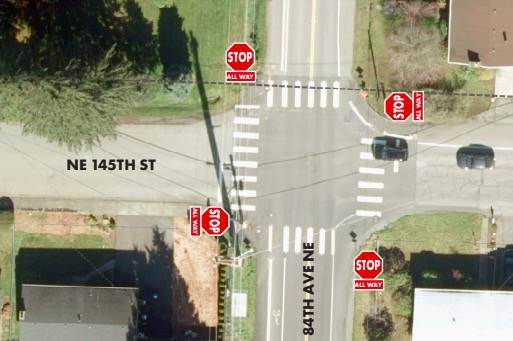 The 84th Avenue Northeast intersection with Northeast 145th Street will be transformed to a four way, helping to reduce the number of collisions.