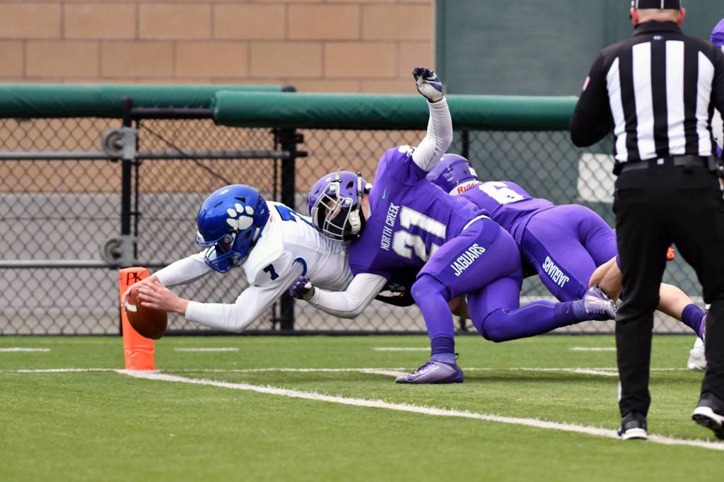 Bothell’s Andrew Sirmon dives from 1-yard out for a touchdown in the Cougars’ 23-13 victory over North Creek on March 20. Also scoring for Bothell were Bryce Kooy with a 6-yard run, Kyree Percival with a 10-yard pass from Sirmon and Charlie Shulkin with a 36-yard field goal. Shulkin also had two PATs. One of North Creek’s touchdowns came on a 4-yard pass from Jack Charlton to Jayden Notoa. In other Northshore action, Woodinville beat Inglemoor, 27-14, on March 19. Photo courtesy of Greg Nelson