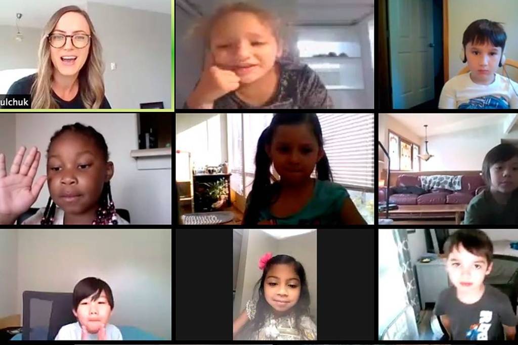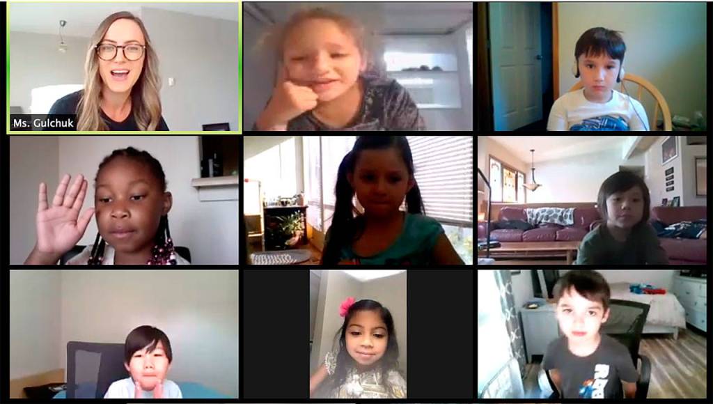 Maria Gulchuk, a teacher in Federal Way, chats with her students via Zoom during online class on in 2020. File photo