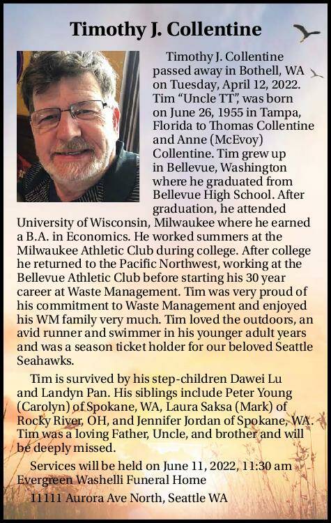 Timothy J. Collentine passed away in Bothell, WA on Tuesday, April 12, 2022. Tim “Uncle TT”, was born on June 26, 1955 in Tampa, Florida to Thomas Collentine and Anne (McEvoy) Collentine. Tim grew up in Bellevue, Washington where he graduated from Bellevue High School. After graduation, he attended University of Wisconsin, Milwaukee where he earned a B.A. in Economics. He worked summers at the Milwaukee Athletic Club during college. After college he returned to the Pacific Northwest, working at the Bellevue Athletic Club before starting his 30 year career at Waste Management. Tim was very proud of his commitment to Waste Management and enjoyed his WM family very much. Tim loved the outdoors, an avid runner and swimmer in his younger adult years and was a season ticket holder for our beloved Seattle Seahawks.