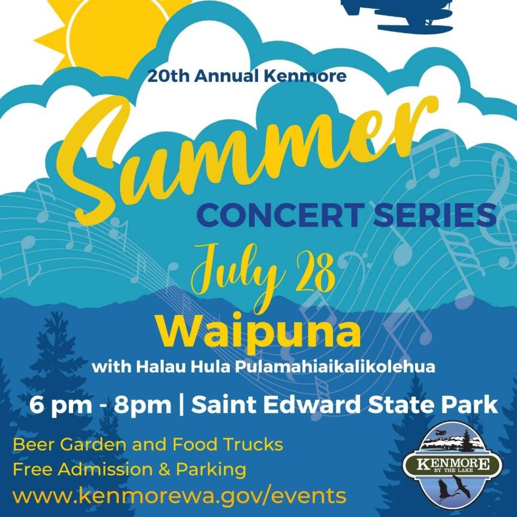 The 20th year of the Kenmore Summer Concert series is coming to an end, and for the final performance of the summer on July 28, Waipuna–with Halau Hula Pulamahiaikalikolehua– will take the stage.