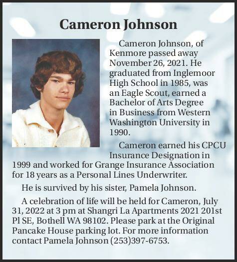 Cameron Johnson, of Kenmore passed away November 26, 2021. He graduated from Inglemoor High School in 1985, was an Eagle Scout, earned a Bachelor of Arts Degree in Business from Western Washington University in 1990.