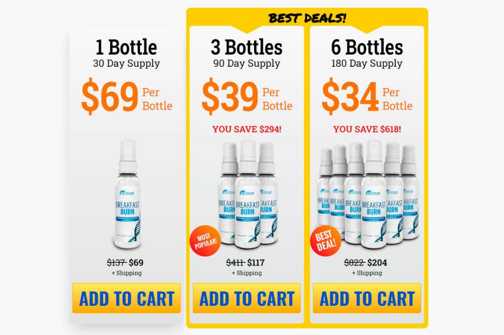 - Anyone can get Breakfast Burn from the product’s official website. However, the supplement is not available in pharmacies or at retailers. Besides, getting it from its official website guarantees that it is the original formula, the best prices, and a solid money-back guarantee. But let’s see how much Breakfast Burn costs and how long its money-back guarantee lasts. Thus, the Breakfast Burn prices are: