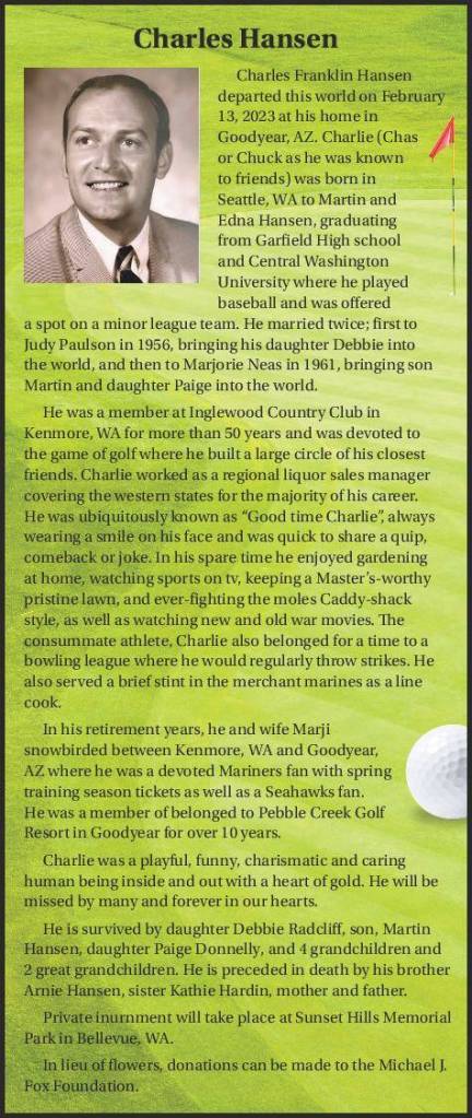 Charles Franklin Hansen departed this world on February 13, 2023 at his home in Goodyear, AZ. Charlie (Chas or Chuck as he was known to friends) was born in Seattle, WA to Martin and Edna Hansen, graduating from Garfield High school and Central Washington University where he played baseball and was offered a spot on a minor league team. He married twice; first to Judy Paulson in 1956, bringing his daughter Debbie into the world, and then to Marjorie Neas in 1961, bringing son Martin and daughter Paige into the world.