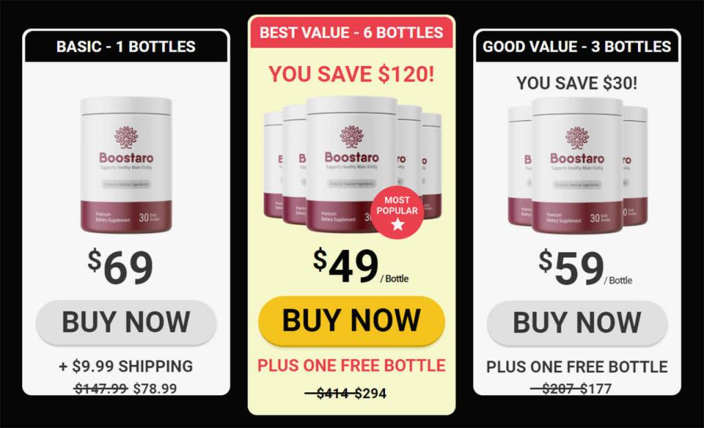 - Purchase three Boostaro bottles: $177 + Free shipping