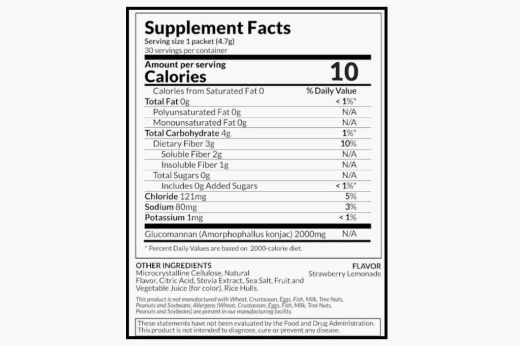 Every scoop contains 20 calories and 4 g of total carbs in the form of dietary fiber. There are also trace amounts of calcium, potassium, and 60 mg of sodium.
