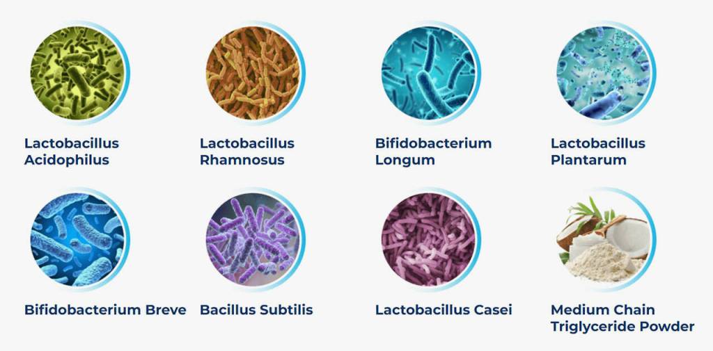 Lactobacillus Acidophilus, Lactobacillus Rhamnosus, Bifidobacterium Longum, Lactobacillus Plantarum, Bifidobacterium Breve, Bacillus Subtilis, Lactobacillus Casei, and Medium Chain Triglyceride Powder.