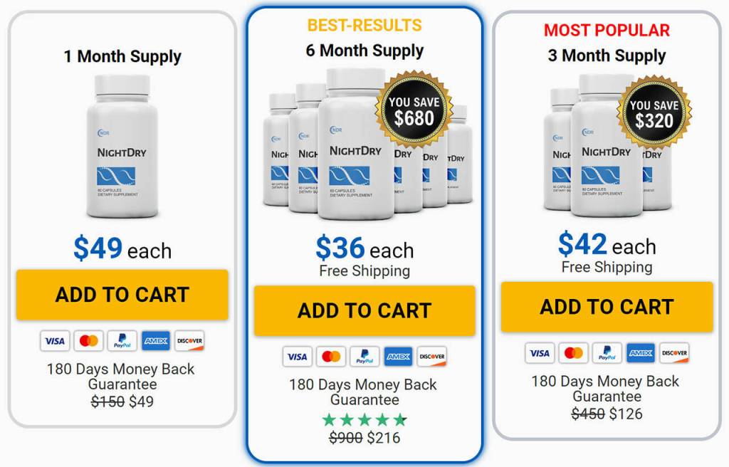 Consumers can visit the official Night Dry website to purchase the product. The company offers a 180-day money-back guarantee and an opportunity to sleep throughout the night with fewer trips to the bathroom. Prices are as follows: