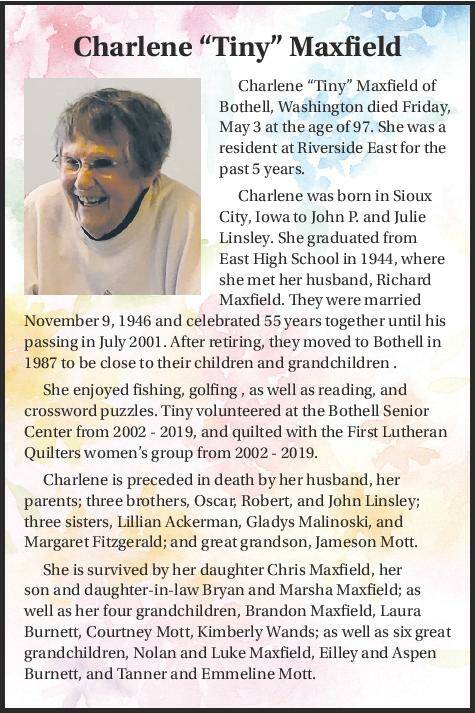 Charlene “Tiny” Maxfield of Bothell, Washington died Friday, May 3 at the age of 97. She was a resident at Riverside East for the past 5 years.