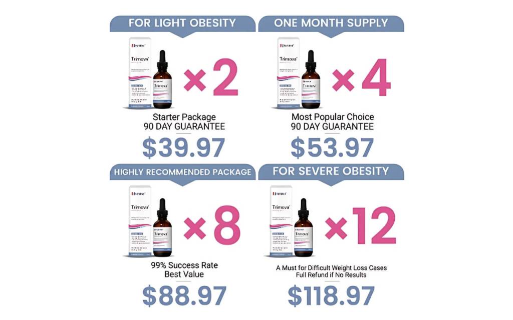 Trimova offers several packages for their Metabolic Boost Vitamin Drops, catering to different needs and budgets: