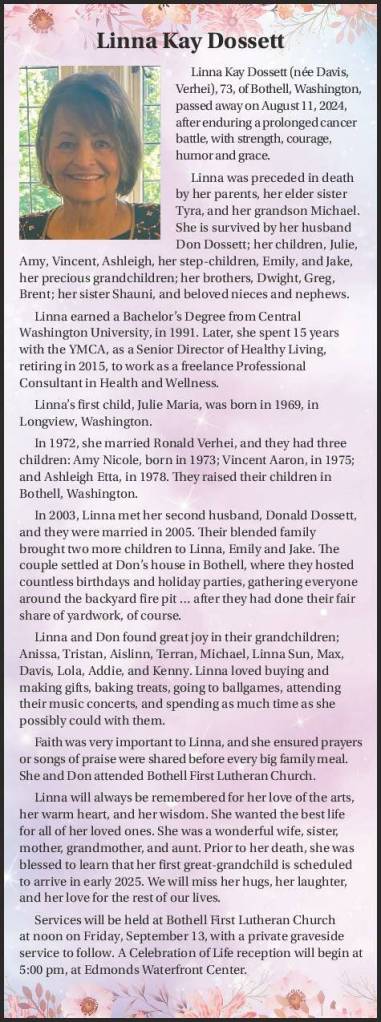 Linna Kay Dossett (née Davis, Verhei), 73, of Bothell, Washington, passed away on August 11, 2024, after enduring a prolonged cancer battle, with strength, courage, humor and grace.