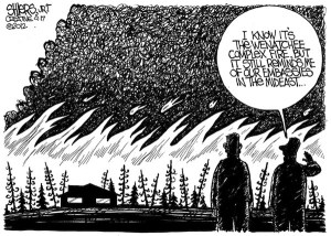 Frank Shiers' editorial cartoon from the Sept. 21 issue of the Bothell-Kenmore Reporter correlates the destructive wildfires sweeping…