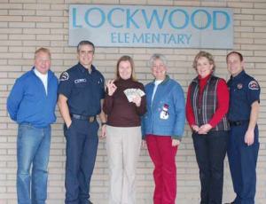 Bothell firefighters gather with Lockwood Elementary employees to hand off some holiday cash.