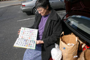 Bothell Sons of Norway member Sue Waldrop browses a stamp collection while sitting with a trunk load of used stamps that her club will eventually send to Norway to provide funding for tuberculosis research and assisting handicapped children.