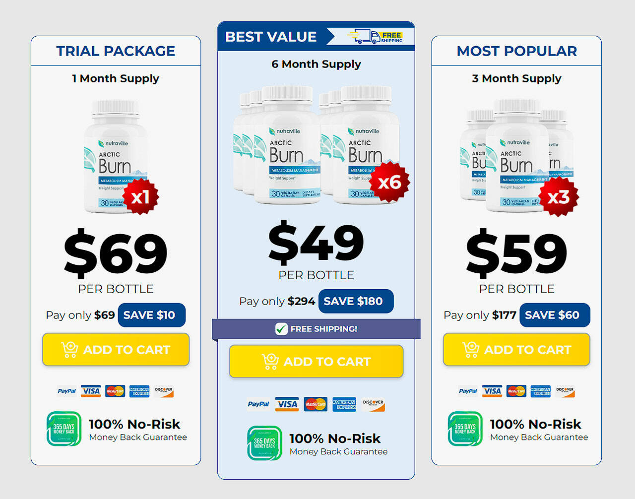 Arctic Burn is available at different pricing tiers to cater to various needs. Individuals can purchase a single bottle of Arctic Burn for the price of $69, offering a convenient option for those who want to try the product or have specific requirements. For those seeking a greater supply, the 3-bottle package is available for $140, providing a significant discount per bottle. Additionally, there is a 6-bottle package available for $294, ensuring an even more cost-effective option for long-term usage or for sharing with friends and family.