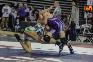 Bothell Cougars wrestler Jay Smith, left, pinned North Creek’s Damon Wallace, right, in just 40 seconds in the first round of the Class 4A state wrestling tournament in the 182-pound weight division on Feb. 15 at the Tacoma Dome. Smith had an overall record of 2-2 at the tourney. Photo courtesy of Don Borin/Stop Action Photography