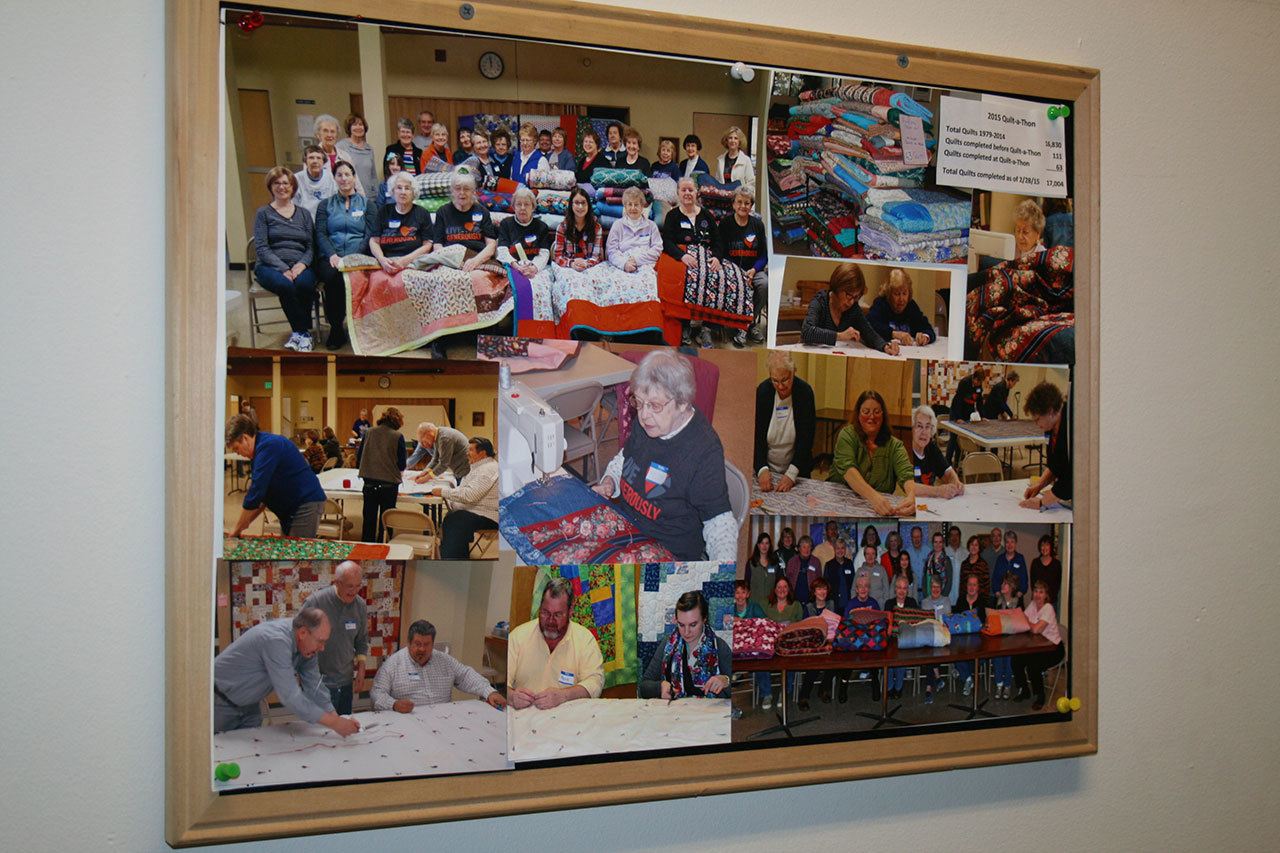 A collage of photos from a previous Quilt-a-Thon is on display at First Lutheran Church of Bothell. CATHERINE KRUMMEY / Bothell Reporter