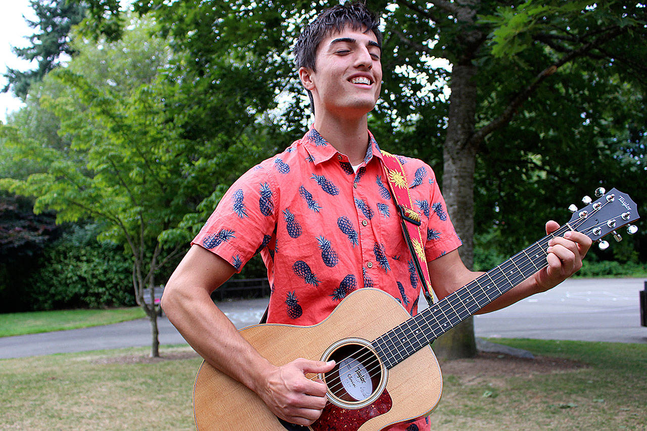 Jaeden Luke sits on a Bothell park bench strumming his guitar, singing softly to himself. His salmon-colored pineapple print shirt complements his subtle tan and white smile.