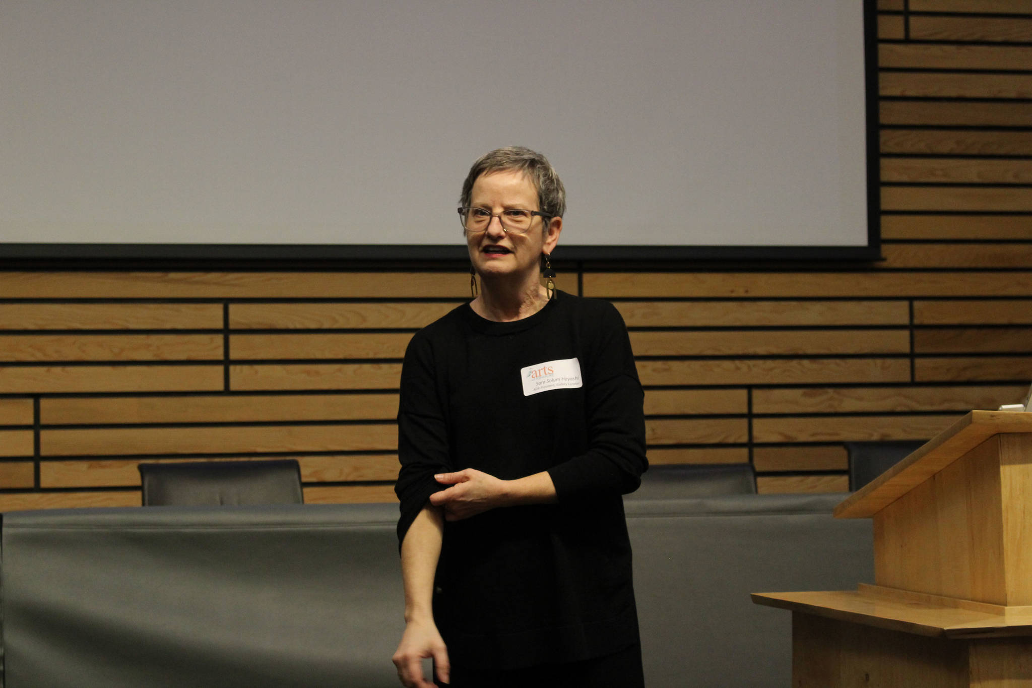 Sara Solum Hayashi, AOK president and one of the featured artists, welcomed guests to the opening with a program and a cheat-sheet to help guests understand skate terminology. She said the program was meant to honor the Jack Crawford Skate Court, as well as highlight the local art community.