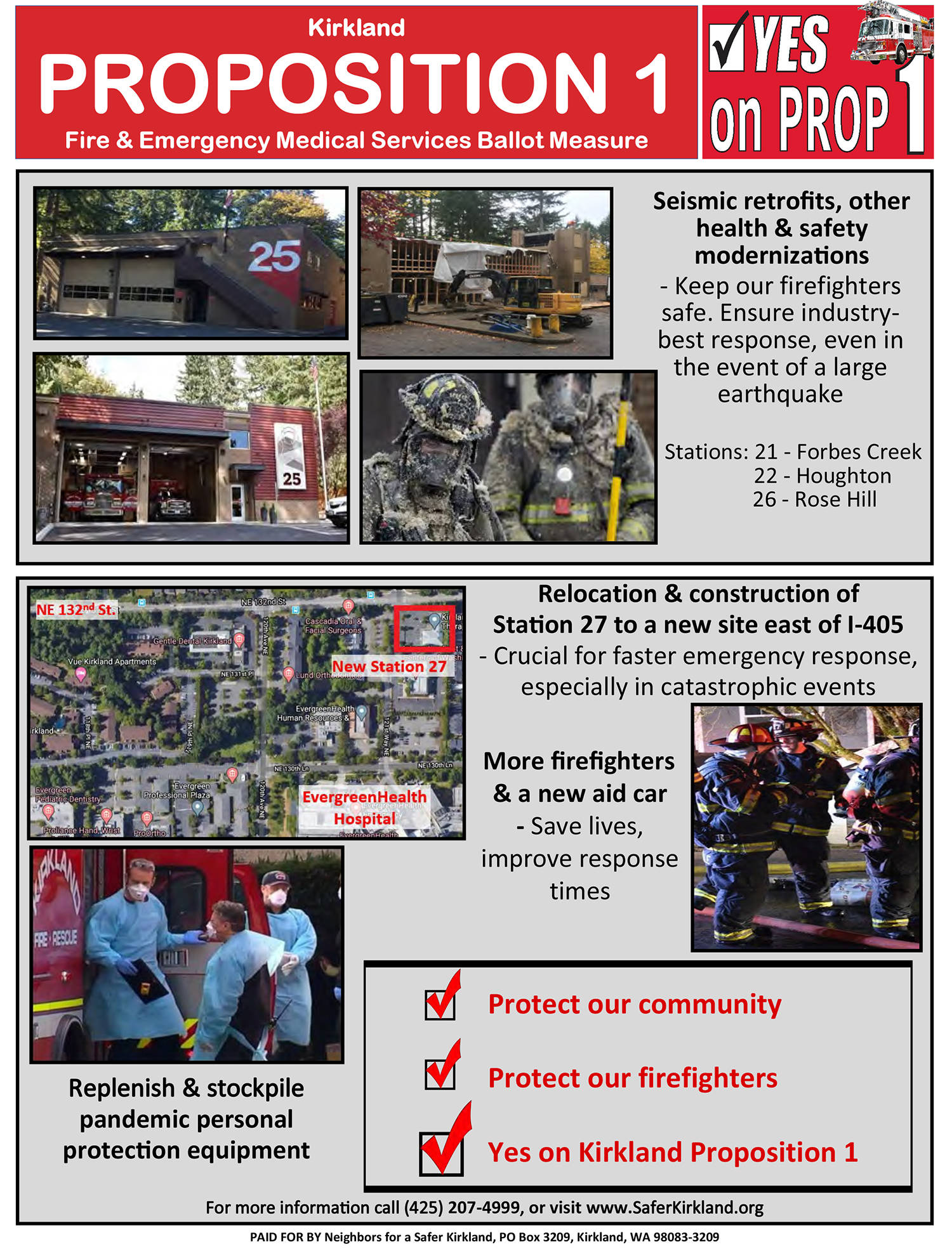 - PPE: The COVID-19 pandemic depleted Kirkland first-responders’ supply of personal protective equipment, and voting YES on Prop 1 allows these first-responders to replenish supplies of gloves, masks and other essential gear.
