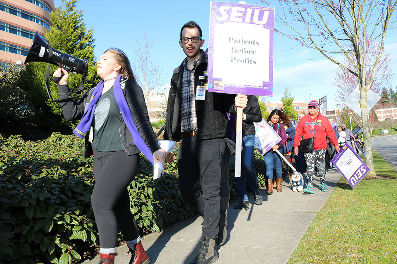 Nearly 1,000 social workers, nursing assistants, case managers, dietary and housekeeping staff who work at the Kirkland hospital and Redmond clinic are represented by the unit that picketed on March 29.