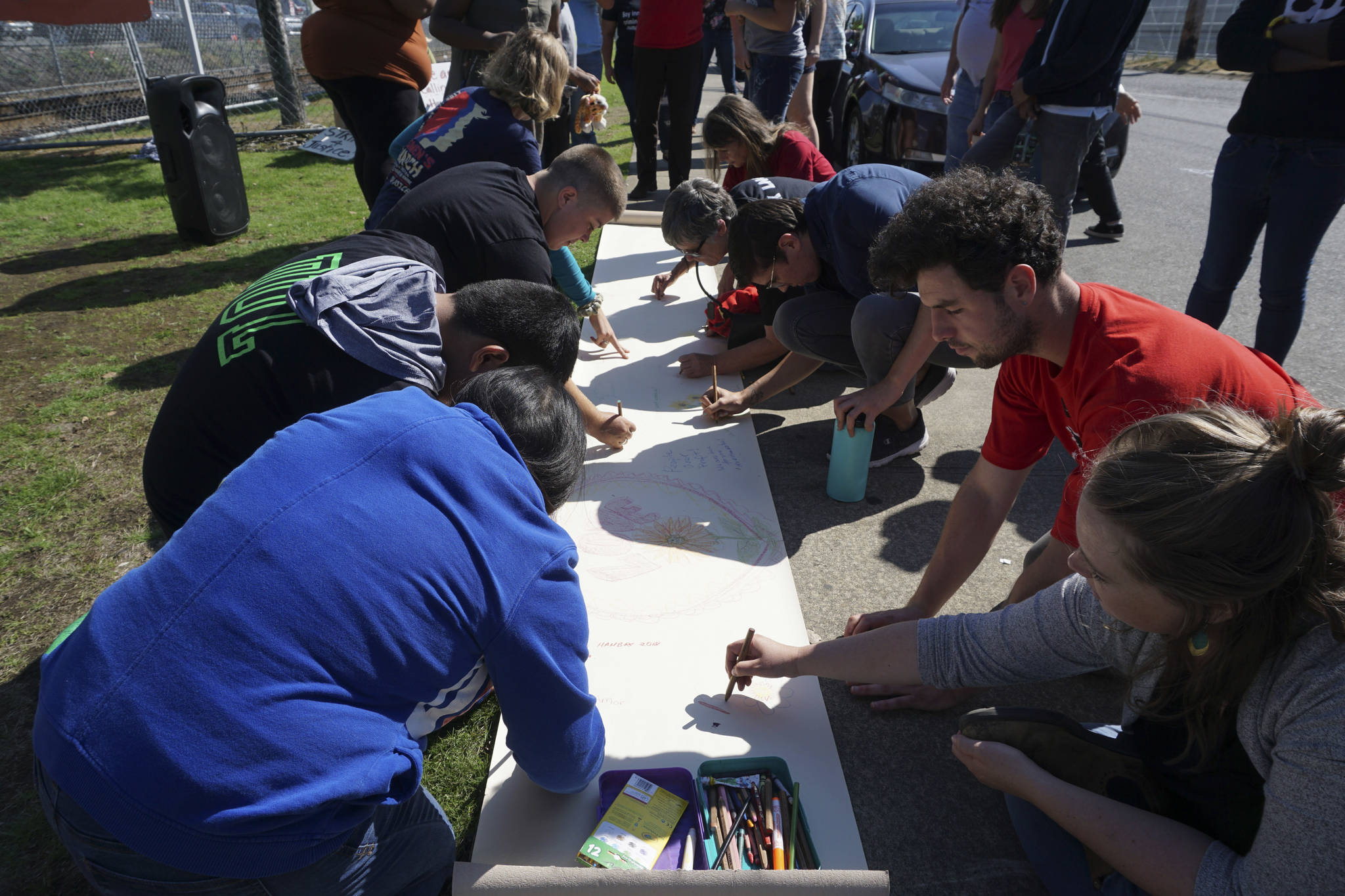 At the end of the rally, demonstrators crouched down to a large white scroll stretched across the sidewalk to write messages for people in detention. Others marched around the periphery of the center in hopes that people inside would hear their chants.