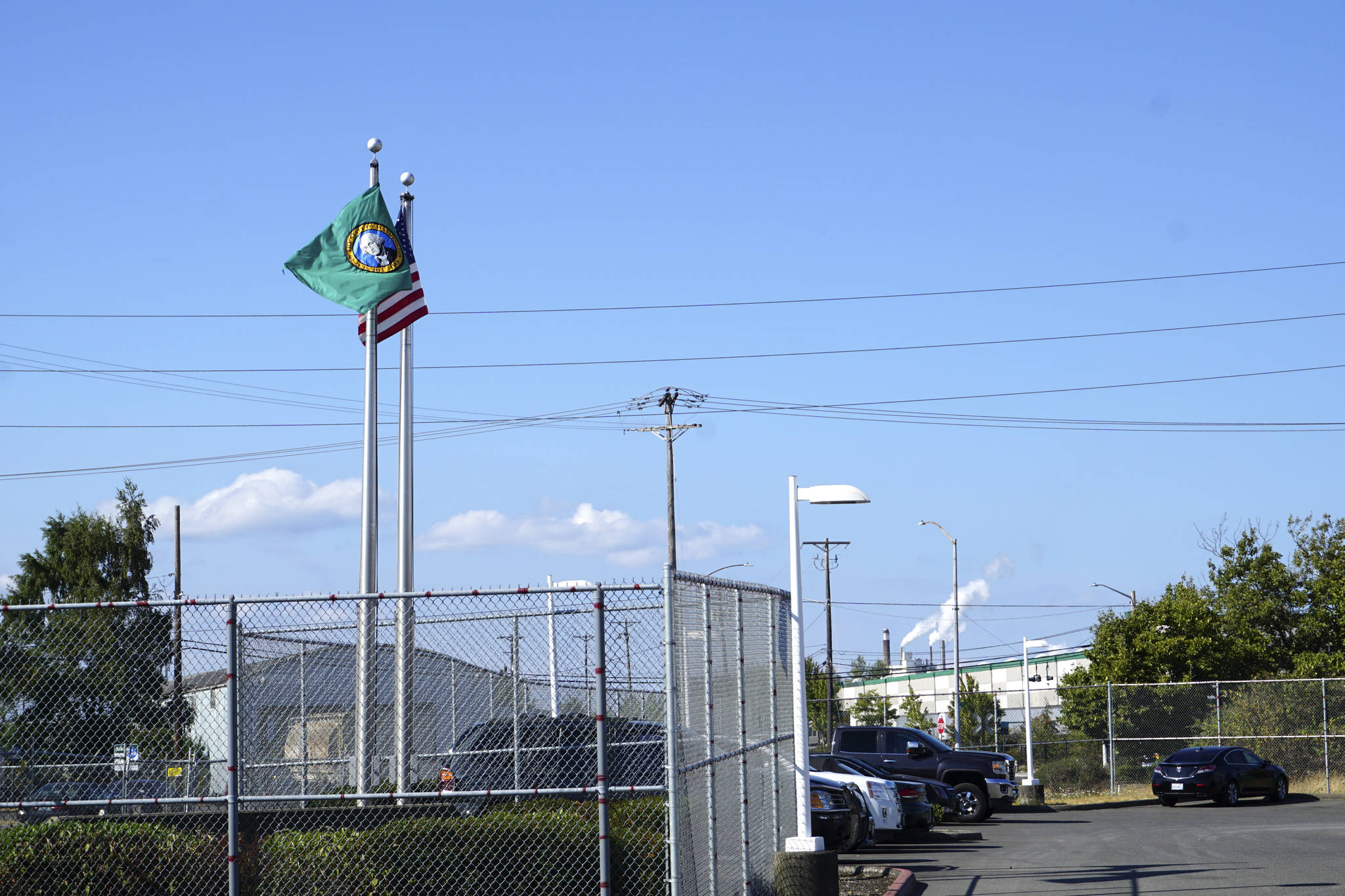 Located on Tacoma’s Tideflats, NWDC sits adjacent to land that the Environmental Protection Agency (EPA) designated as a Superfund site—one of the nation’s most toxic areas due to the dumping of hazardous waste—referred to as the “Tar Pits.” The detention center complex was eerily quiet during a recent visit, somehow immune to the din of traffic on a state highway less than a quarter mile away. A barbed wire fence glistened in the sun and encased the sprawling complex, separating it from an active rail line situated 8 feet away from yet another fence recently erected by the City of Tacoma in response to protests on the public right-of-way. Plumes of smoke rising from industrial plants juxtaposed the billowing American and Washington state flags that mark the center’s entrance.