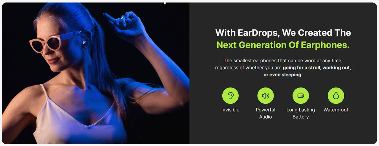 The manufacturer of EarDrops claims that its product is a testament to the next generation of earphones, redefining the audio experience with a touch of sophistication in its modern design. Its remarkable tiny build helps set this device apart – they are practically invisible when viewed from the front, blending seamlessly into your daily activities without drawing unnecessary attention.