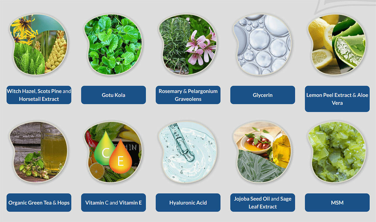 These ingredients are packed with antioxidants that help promote healthy skin and nails. Witch hazel has anti-inflammatory agents that reduce swelling, soothe skin, and eliminate redness. Scots pine removes harmful bacteria, and horsetail extract strengthens your nails and reduces the risk of breaking.
