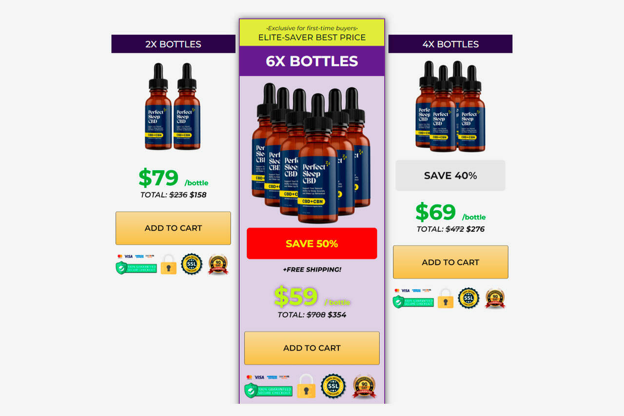 Perfect Sleep CBD is priced at $59 to $79 per bottle as part of a 2024 promotion. The ordinary retail price is $118 per bottle. All six-bottle purchases come with a 50% discount off the ordinary retail price and free shipping.